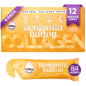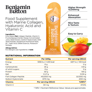 A ready‑to‑drink 30ml sachet delivering 12,000mg hydrolysed marine collagen with Vitamin C and Hyaluronic Acid to support skin hydration, elasticity, hair and joint health. The natural mango flavour makes it an easy daily beauty and wellness boost.