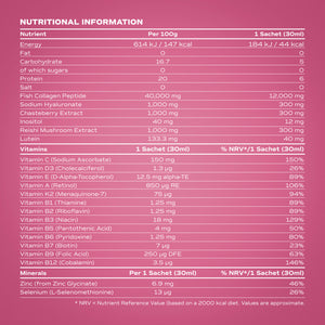 Cada sobre de 30ml contiene 12,000mg de colágeno marino de alta calidad y con Vitaminas A, B1, B2, B3, B5, B6, B7, B9, B12, C, D3, E, K2, está libre de frutos secos, gluten, lactosa, soja y aditivos y edulcorantes artificiales y es Halal. Cada sobre tiene 44 calorías por 6g de proteína.